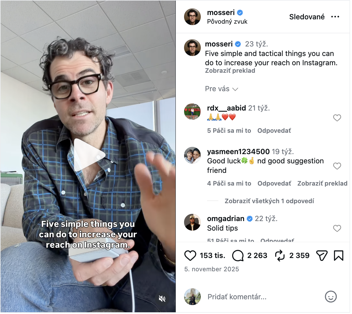 Instagram Reels sú momentálne najdôležitejším formátom z pohľadu dosahu. Instagram ich aktívne propaguje, pretože konkurujú platformám ako TikTok a zároveň zvyšujú čas, ktorý používatelia trávia v aplikácii. Algoritmus pri Reels sleduje najmä to, či si používateľ video pozrie celé, či ho prehrá opakovane a či naň reaguje. Veľkú váhu má aj to, či si video uloží alebo zdieľa. Práve preto sú Reels najlepším nástrojom na oslovenie nového publika a budovanie virality.